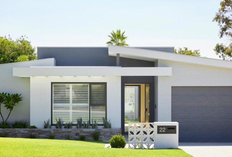 Strong lines and monochrome tones create a cool, crisp elevation. White painted brick adds subtle texture, contrasted with darker elements and a stone-clad garden bed. Varying textures, materials and geometric shapes were all employed to produce this stunning Mid-Century modern-styled elevation.