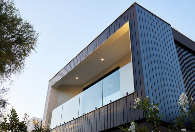 Elements of light and dark reflect the home’s architectural balance of masculinity and femininity throughout. Moody black panel cladding is a striking statement upon the crisp white exterior of the home.